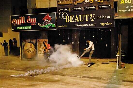 ■5月15日,一名巴勒斯坦人在约旦河西岸城市伯利恒街头踢开以色列边防警察发射的催泪弹。新华社发 |
