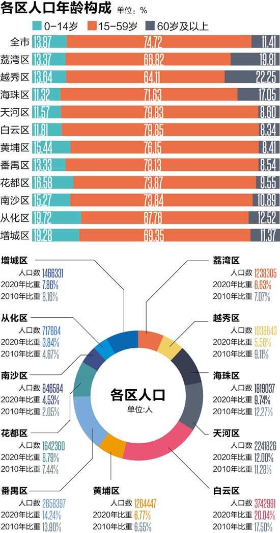 广州第七次全国人口普查数据出炉 全市常住人口总负担系数27.69%,仍处于人口红利黄金期 18日,广州市统计局发布《广州市第七次全国人口普查公报》。2020年11月1日零时,广州常住人口18676605人。其中白云区人口374万,自上世纪90年代以来便居各区第一。另一方面,广州常住人口总负担系数27.69%,仍处于人口红利黄金期。专家表示,人口规模的扩大显示出广州强大的城市吸引力。 ■采写:新快报记者 王彤 王娟 通讯员 穗统宣 李佳莉 南沙从化人口少于100万 广州11个区中,人口超过300万人的区有1个,为白云区;在200万人至300万人之间的区有2个,分别是番禺区和天河区;在100万人至200万人之间的区有6个,分别是荔湾区、越秀区、海珠区、黄埔区、花都区和增城区;少于100万人的区有2个,分别是南沙区和从化区。其中,常住人口居前五位的白云区、番禺区、天河区、海珠区、花都区人口合计占全市人口比重为64.81%,人口集聚效应明显。 分区域看,中心城区(荔湾区、越秀区、海珠区和天河区)人口为6337811人,占33.93%;外围城区(白云区、黄埔区、番禺区、花都区、南沙区和增城区)人口为11621110人,占62.23%;生态片区(从化区)人口为717684人,占3.84%。 广州市统计局相关负责人介绍,白云区自上个世纪90年代以来,便一直占据第一人口大区的位置。十年间,白云人口占比上升2.54个百分点,是比例上升最多的区。 白云区如何成为第一人口“大户”的?广州市社会科学院城市管理研究所副研究员宁超乔指出,相对其他中心城区来说,白云区拥有较丰富的土地资源,逐渐成为广州先进制造业布局的主战场。“在所有产业中,制造业是就业吸纳能力最为强劲的产业,夯实了白云区‘人口第一区’的地位。” 宁超乔说,随着全球制造业布局转移和白云区创新驱动发展、经济转型升级的新一轮产业布局战略的实施,也会影响到白云区下一步人口数量和结构的变化。 白云15-59岁人口占比近八成 分区来看年龄构成,11个区中,15-59岁人口比重在65%以上的区有10个,在60%-65%之间的区有1个。6个区65岁及以上老年人口比重超过7%,其中,1个区65岁及以上老年人口比重超过14%。 白云、天河、番禺15-59岁人口比重分别为79.85%、79.83%、78.13%,劳动人口比重占据绝对优势。从化、增城0-14岁人口比重分别为19.72%、19.28%,远超第三名花都16.58%。60岁及以上人口占比最多的区为越秀,达22.25%,该区65岁及以上占比就达15.88%。老城荔湾、海珠紧随其后,60岁及以上人口占比分别为19.81%、17.05%。白云(8.34%)、黄埔(8.41%)、番禺(8.54%)、天河(8.60%)则是相应人口占比较少的区,比重不超9%。 常住人口平均年龄为35.4岁 全市常住人口中,60岁及以上人口为213.06万人,占11.41%,其中65岁及以上人口为146.03万人,占7.82%。市统计局专家表示,广州进入老龄化社会,并不代表着人口红利已经消失,从多方面情况来看,广州市目前仍处于人口红利黄金期。 一是全市1867.66万常住人口中,0-14岁人口占比达13.87%,比2010年提高2.4个百分点,少儿人口占比提升。 二是15-59岁的劳动年龄人口占比为74.72%,虽比2010年下降4.07个百分点,但占比仍保持较高水平。 三是广州市常住人口平均年龄为35.4岁,低于全国的38.8岁,总体人口平均年龄正值“当打之年”。 四是大量跨市流入的青壮年人口选择广州作为安居乐业的落脚点,不仅为广州提供了丰富的劳动力资源,还延缓了广州人口老龄化进程。此次普查结果显示,广州常住人口总负担系数(指0-14岁和65岁及以上人口与15-64岁人口之比)为27.69%,虽比2010年的22.08%有所提高,仍明显低于50%的临界线,也明显低于全国的45.9%和全省的37.8%,在全国主要城市中也处于较低水平。广州常住人口红利黄金期特点依然明显。 天河每10万人中4万人读过大学 全市常住人口中,拥有大学(指大专及以上)文化程度的人口为509.45万人。每10万人中拥有大学文化程度的由2010年的1.92万人上升为2.73万人,15岁及以上人口的平均受教育年限由10.84年提高至11.61年。文盲人口(15岁及以上不识字的人)为107695人,与2010年相比减少12965人,文盲率由0.95%下降为0.58%,下降0.37个百分点。 在教育方面,传统老城区仍占据绝对优势。具体到区,天河每10万人中拥有大学文化程度的人数为42929,全市最高。第二名越秀这一数字达37253;黄埔为29864人;海珠29042人;番禺27896人;荔湾为24880人;白云23588人;从化21705人;增城20256人;花都18411人;南沙17894人。15岁及以上人口平均受教育年限中,天河、越秀、黄埔分别以13.06、12.63、11.92年位列前三名。 从化城镇化率不足50% 全市常住人口中,居住在城镇的人口为1609.67万人,占86.19%;居住在乡村的人口为257.99万人,占13.81%。横向来说,广州城镇化率水平已经超过发达国家(80%)。纵向方面,与2010年相比,城镇人口比重提高2.41个百分点。专家解读,在以人为核心的新型城镇化战略推动下,广州市常住人口城镇化率持续稳步提升,成为实现高质量发展的重要力量“源泉”。 分区来看,荔湾、越秀、海珠、天河城镇人口比重已达100%。黄埔的城镇化率为92.22%;番禺为89.58%;白云为81.37%;南沙为73.28%;增城为73.16%;花都为69.65%;从化以45.80%的城镇化率排名最末。 家庭户规模继续缩小 广州共有家庭户718.50万户,集体户82.27万户,家庭户人口为1597.77万人,集体户人口为269.89万人。平均每个家庭户的人口为2.22人,比2010年第六次全国人口普查的2.73人减少0.51人。家庭户规模继续缩小,主要是受当