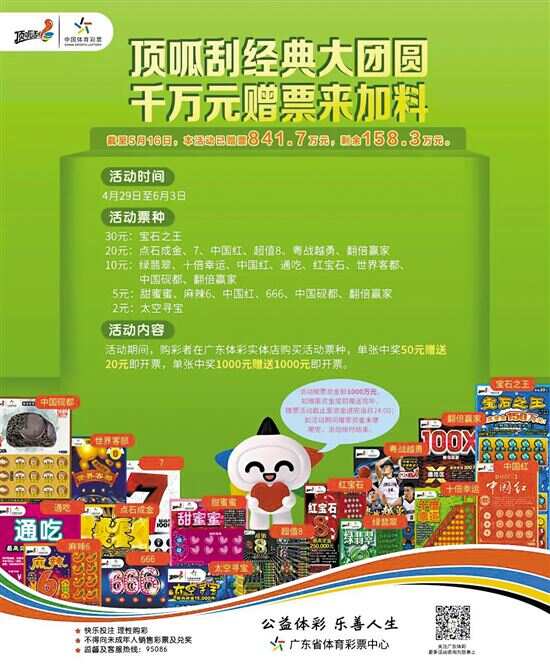 体彩大乐透“10亿元大派奖”第17期开奖,全国送出5注头奖 新快报讯 5月17日,体彩大乐透迎来“10亿元大派奖”的第17期开奖,当期全国送出5注头奖,其中4注为2299万余元的追加投注一等奖,1注为1000万元基本投注一等奖。广东中出全国唯一基本投注一等奖,落户深圳。 深圳10元票中基本头奖 第21055期前区开出号码“03、06、10、11、24”,后区开出号码 “10、11”。前区大小比1∶4,奇偶比2∶3,“03、06”已经连续三期开出,“24”为遗漏28期开出的冷号;后区开出大号连号组合,“11”为隔期开出的跳号。 本期全国共开出5注一等奖。其中,4注为2299万余元(含800万元追加奖金+499万余元派送奖金)追加投注一等奖,分落吉林长春、河南郑州、湖北武汉、云南德宏;1注为1000万元基本投注一等奖,落户广东深圳。 记者从广东省体彩中心获悉,深圳的基本一等奖出自福前路17号的4402038463体彩实体店,中奖的彩票是一张10元5注单式票,只遗憾未选择追加,错失1299万余元追加奖金及派送奖金。 下期头奖派奖2000万元 同期二等奖中出100注,每注奖金15.69万余元;其中64注采用追加投注,每注多得追加奖金12.55万余元、派送奖金11.71万元。追加后,二等奖单注总奖金39.96万余元。此外,当期三至九等奖共7个固定奖级的追加投注享受到了固定奖派奖实惠,固定奖共派送金额1826万多元。 本期全国销量为3.40亿元,为国家筹集彩票公益金1.22亿元。奖池方面,本期开奖结束后,8.32亿元滚存至5月19日(周三)开奖的第21056期。届时,一等奖派奖2000万元,二等奖派奖750万元,固定奖派奖余额为2743万余元。 粤赠票活动剩最后一期 目前10亿元派奖一、二等奖尚余3期派奖,固定奖余额预计仅剩余最后1~2期,而广东1500万元大赠票活动则剩余最后一期,大家切莫错过最后的派奖机会了。 需提醒购彩者的是,追加投注是参与本次大乐透派奖活动的唯一“门槛”,即在2元基本投注的基础上,多花1元进行追加投注。在派奖期间进行追加投注的彩票,若中得一等奖或二等奖,单注奖金最高可翻倍。在派奖期间,进行追加投注且中得三至九等奖中任意奖级的彩票,同时中得派奖奖金,单注派奖奖金为当期对应奖级单注奖金的50%。而广东赠票活动规则是满额赠票,购买单张单期彩票面值60元(含)~179元(含),赠6元2注追加单式票;单张单期彩票面值180元(含)~499元(含),赠18元6+2追加复式票;单张单期彩票面值500元及以上,赠63元7+2追加复式票。多期票不参与活动。