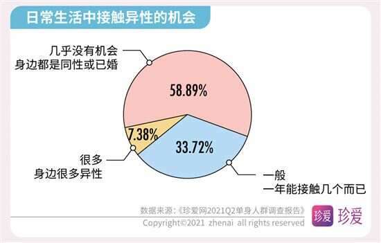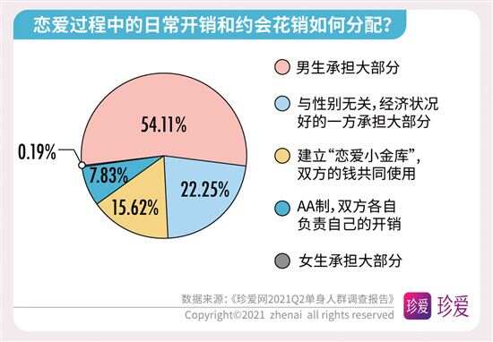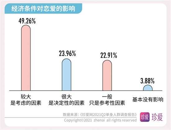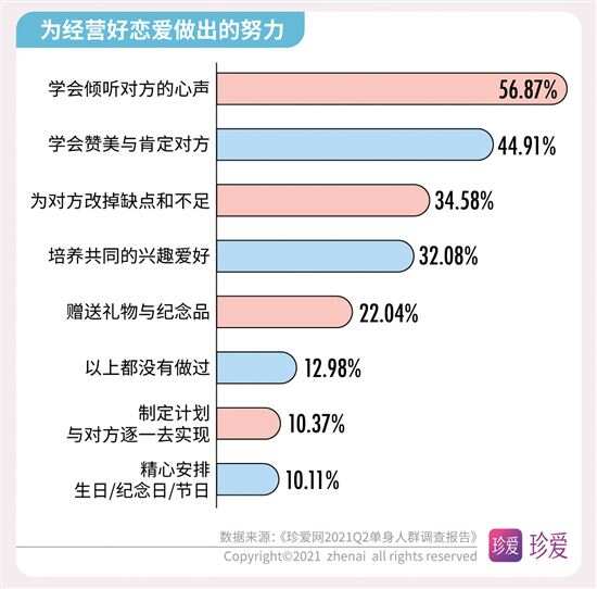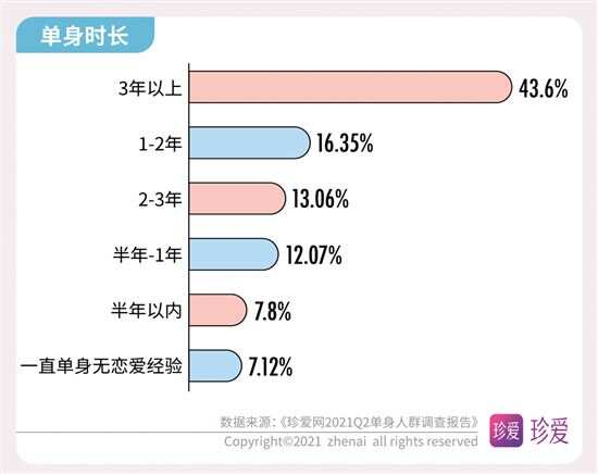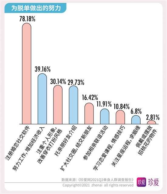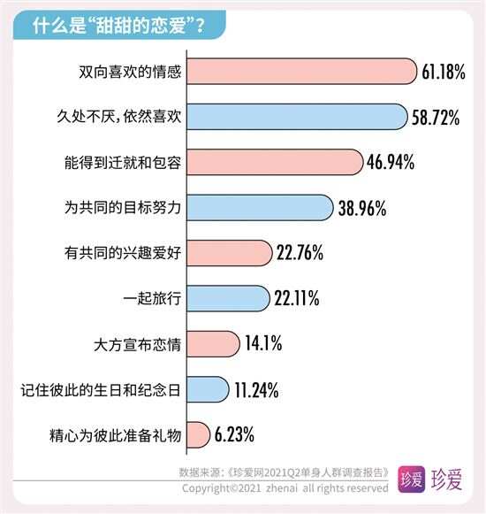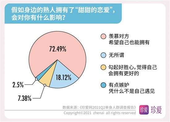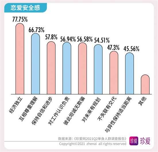 《珍爱网2021Q2单身人群调查报告》解读婚恋数字 多数人为了恋爱学会倾听和改掉自身不足 近期,“中国单身人口超2亿”的话题又上了热搜榜,在520已经成为当下年轻人秀恩爱的日子里,单身人群的话题再度引起热议。中国知名婚恋网站珍爱网(zhenai.com)在520发布2021年第二季度的《单身人群调研报告》来探讨单身人群的现状和恋爱观,此次报告针对珍爱网2亿会员线上抽样调查,共抽取2759份有效样本进行数据分析。数据显示,超七成的人渴望得到“甜甜的恋爱”;近半数人单身时长超过3年以上;超五成人生活圈难以接触到合适单身异性;脱单难和为脱单努力等话题成为大家关注的焦点,并通过恋爱安全感及恋爱经济观等数据了解到当下年轻人的恋爱观。 近半数人单身时长超3年 超五成人生活圈 难以接触到合适单身异性 单身太久了,都不知道心动是什么感觉了。在调研数据中显示,有近半数人(43.6%)的单身时长超3年,其中女性占比大于男性。数据进一步研究发现,近六成(58.89%)人日常几乎没有机会接触单身异性,工作生活圈子里接触到的都是同性或已婚。 而影响脱单主要因素是:越来越难以心动(占41.41%)、择偶太理想化(占37.7%)、不主动不积极(占36.9%)、太宅无社交活动(占35.65%)、工作太忙(占31.38%),其次是性格内向、个人经济条件差、对自己的外貌不自信、容易和异性发展成“哥们”以及原生家庭影响和父母干涉等,这些都是成为当代年轻人脱单难的原因。 超七成人为脱单 注册婚恋社交软件 为恋爱学会倾听和改掉自身不足 “宅生活”让很多年轻人失去社交能力,当下的单身青年们表面上不善社交,其实暗地里一直在为脱单努力着。数据显示,78.18%的人都有注册婚恋社交软件,来增加认识异性的机会。有39.16%的人通过努力工作增加收入来提升自己的“恋爱成本”,有30.14%的人会定期做美容、购置服饰来提升个人形象增加“恋爱自信”,有29.73%的人托亲朋好友介绍增加“恋爱机会”,还有11.91%的人会去参加相亲联谊活动,为了脱单,他们一直在付出行动。 当然,恋爱也需要认真经营的,调研数据显示,有56.87%的人学会倾听,44.91%的人会赞美和肯定对方,34.58%的人会改掉缺点和不足,32.08%的人会培养共同兴趣,22.04%的人会赠送礼物,由此可见,当下的年轻人不仅在工作生活上很努力,在情感生活上也同样在努力。 超七成人都羡慕“甜甜的恋爱” 现实生活中的爱情故事不至于乏善可陈,许多美好的瞬间是切实存在的。在这次调研中我们发现,越来越多的人羡慕别人的“甜甜的恋爱”,那到底什么是“甜甜的恋爱”呢?据调研数据显示,61.18%的人希望恋爱是双向喜欢的情感,58.72%的人想和对方久处不厌,46.94%的人想被迁就和包容,38.96%的人会为共同的目标而努力,22.76%的人希望有共同的兴趣爱好,还有人则认为甜甜的恋爱是希望一起去旅行,大方宣布恋情、记住彼此的生日和纪念日,能精心为彼此准备礼物。而当问及身边的熟人拥有了“甜甜的恋爱”会对你有什么影响时,72.49%的人表示会很羡慕,希望自己也能拥有。 珍爱网情感专家张莎莎表示,大家是因爱而在一起,并不是为了结婚而恋爱,所以能感受到爱情的甜蜜。当然,想要让爱情保鲜,保留更多“甜甜”的体验,恋人要学会在关系中保持对自己角色的觉知,拓展自己的生活,呈现出更多新的可能性,能看到对方的状态,让彼此都处于好玩的、愉快的、不断变化的状态中,这样才能保持对彼此的爱意不消退。 关于恋爱中的安全感: 超七成人希望经济独立 超六成人希望 彼此互相尊重和理解 恋爱中的安全感,就是彼此觉得可以依靠。数据调查显示,有七成人希望恋爱中经济能独立;有六成以上人希望恋爱中能互相尊重和理解;五成以上人希望恋爱中保持自信和进步,对工作认真负责,彼此坦诚无欺骗,对未来有规划;四成以上人希望恋爱过程不要失联,凡事都有交代,与异性保持适当距离。可见经济独立对恋爱中人来说有极大的安全感。 珍爱网情感专家张莎莎指出,恋人们在经济上平等独立,会带来更多底气和自信,不会因为物质关系依附于对方,也不容易陷入金钱上过度索取、精神上过度控制的不良关系。 另外,在恋爱禁忌方面,调查数据也发现,有67.23%的人担心对方与异性暧昧不清,57.19%的人害怕长时间冷战,55.45%担心对方花心出轨,44.84%怕遇到脾气暴躁的人,38.53%的人拒绝抠门小气,36.28%怕逃避拒绝沟通,31.13%不想与前任有联系,这些都是令人难以接受的。 关于恋爱的经济观: 近五成人认为经济条件 是恋爱中的考虑性因素 消费观、经济观,已经成为了年轻人恋爱最看重的,此次调研数据发现,有近五成人认为经济条件对恋爱影响较大,是考虑性因素。在传统的消费理念中,通常是男性占消费主导,在此次调研中发现,过半数人认为男生应该承担恋爱过程中的日常开销和约会花销;另外有15.62%的人会坚持恋爱经济上的平等,认为应“建立恋爱小金库”,双方的钱共同使用。 珍爱网情感专家张莎莎表示,“建立恋爱小金库”是当下年轻人喜欢的方式,共同付出共同享受,通过金钱来磨合两人的消费观,这不仅是关于钱的问题,而是让双方变得更了解、更契合的过程,这样相处才能建立更健康、更亲密的关系。