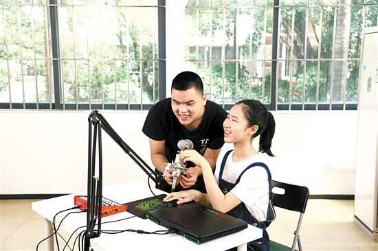 ■谭信钊(左)与陈恩琳(右)做电台,没有文稿,基本都是凭着自己的记忆朗读,需要他们花很多时间把文稿背诵下来,重复录很多遍,录完后反反复复地听和调整,才能呈现出比较流畅的节目效果。 |