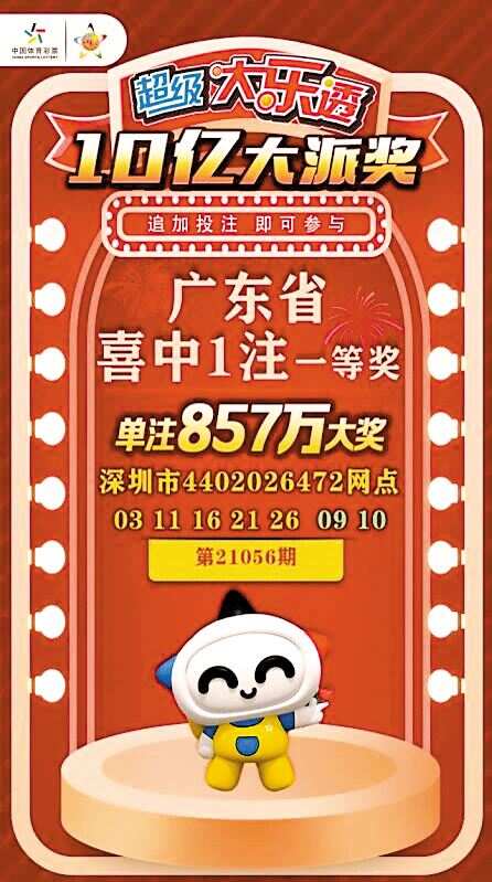 ■新快报记者 陆妍思 广东连续3期揽获大乐透一等奖!5月19日,体彩大乐透迎来“10亿元大派奖”的第18期开奖。当期全国共开出9注一等奖。其中,7注为1829万余元追加投注一等奖,2注为857万元基本投注一等奖。广东中出1注基本投注一等奖,落户深圳。 广东连续3期揽获一等奖 第21056期大乐透开出的中奖号码为:前区“03、11、16、21、26”;后区“09、10”。前区大小比2∶3,奇偶比3∶2,“03、11”为上期重号,其中“03”更连续4期开出,“26”为遗漏25期开出的冷号,开出两组同尾号“11、21”和“16、26”;后区开出大号连号组合,“10”为上期重号。 本期全国共开出9注一等奖。其中,7注为1829万余元(含686万元追加奖金+285万余元派送奖金)追加投注一等奖,分落北京朝阳、浙江金华、湖北襄阳、湖南娄底、四川成都、陕西榆林、新疆喀什。2注为857万元基本投注一等奖,分落广东深圳、河南洛阳。 据核查,花落深圳的基本一等奖出自玉塘街道王律社区三区173号的4402026472体彩实体店,中奖的彩票是一张10元5注单式票。遗憾未选择追加,从而错失971万多元的追加和派奖奖金。 值得一提的是,广东连续3期揽获大乐透一等奖,上期的开奖中也是深圳购彩者,同样凭借10元小单揽获1注1000万元的基本一等奖。 追加投注是大乐透独有的投注方式,在2元基本投注的基础上,多花1元进行追加投注,可多得80%的浮动奖奖金。本次10亿元大派奖的唯一参与条件就是追加投注。 固定奖派奖迎最后一期 同期二等奖开出100注,每注奖金15.20万余元;其中64注采用追加投注,每注多得追加奖金12.16万余元、派送奖金11.71万元。追加后,二等奖单注总奖金39.07万余元。 此外,当期三至九等奖共7个固定奖级的追加投注享受到了固定奖派奖实惠,固定奖派送金额为1907万余元。 本期全国销量为3.39亿元,为国家筹集彩票公益金1.22亿元。奖池方面,当期开奖结束后,7.89亿元滚存至5月22日(周六)开奖的第21057期。届时,一等奖派奖2000万元,二等奖派奖750万元,固定奖派奖余额为836万余元。目前10亿元派奖已进入倒计时,预计一、二等奖尚余2期派奖,固定奖派奖仅剩最后一期。 需提醒购彩者的是,追加投注是参与本次大乐透派奖活动的唯一“门槛”,即在2元基本投注的基础上,多花1元进行追加投注。在派奖期间进行追加投注的彩票,若中得一等奖或二等奖,单注奖金最高可翻倍。在派奖期间,进行追加投注且中得三至九等奖中任意奖级的彩票,同时中得派奖奖金,单注派奖奖金为当期对应奖级单注奖金的50%。而广东赠票活动规则是满额赠票,购买单张单期彩票面值60元(含)~179元(含),赠6元2注追加单式票;单张单期彩票面值180元(含)~499元(含),赠18元6+2追加复式票;单张单期彩票面值500元及以上,赠63元7+2追加复式票。多期票不参与活动。