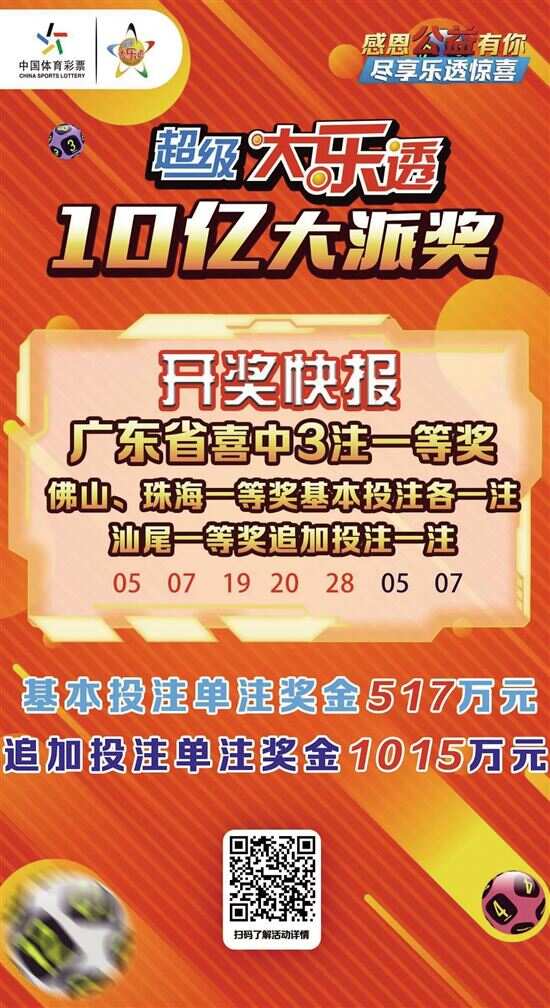广东中出1注1015万、2注517万 新快报讯 记者陆妍思报道 5月22日,超级大乐透第21057期开出39注一等奖,全国18地购彩者分享惊喜,这也是大乐透10亿元大派奖第19期开奖,一等奖呈现“撒花”式分布,让派奖福利惠及更多购彩者。广东共中出3注一等奖,其中1注1015万余元追加一等奖,落户汕尾,另外2注517万余元基本一等奖分落珠海、佛山。目前10亿元派奖活动一、二等奖只剩最后一笔派奖资金,大家切莫错过“尾班车”了。 39注一等奖24注追加 第21057期大乐透的中奖号码为:前区“05、07、19、20、28”;后区“05、07”。前区号码大小比、奇偶比均为3∶2,“28”“15”分别为遗漏20期、15期开出的冷号;后区开出一小一大的奇连号组合。 当期全国共中出39注一等奖,其中24注为1015万余元(含517万余元基本投注奖金+46万余元基本投注派奖奖金+414万余元追加奖金+37万余元追加派奖奖金)追加投注一等奖,贵州中出7注,江西中出5注,上海、重庆各中出2注,河北、广东、辽宁、吉林、江苏、四川、陕西、甘肃各中出1注;15注为517万余元基本投注一等奖,北京、江苏、广东、四川各中出2注,河北、内蒙古、浙江、山东、河南、重庆、西藏各中出1注。 贵州江苏各爆5000万 贵州7注一等奖中有6注落户遵义,其中5注由一家实体店售出的一张15元的5倍1注追加单式票独中,单票总奖金达到5075万余元。江苏的5注追加一等奖由一张315元5倍“7+2”复式票所独中,单票中奖金额5099万余元。 广东当期中出3注一等奖,其中1注追加一等奖出自汕尾海丰县城西华路242号的4413013049体彩实体店,中奖彩票是一张6元2注追加单式票。另外2注基本一等奖分别花落珠海和佛山,珠海的基本一等奖出自景晖路3号34号铺的4403003104体彩实体店,中奖彩票是一张36元“6+3”复式票;佛山的基本一等奖出自大沥镇太平体育西路2号自编1-2号铺的4405030161体彩实体店,中奖彩票是一张42元“7+2”复式票。 对比可见,由于派奖只针对追加投注进行,汕尾中得追加一等奖的幸运购彩者,在单注一等奖方面多拿497万元追加奖金及派送奖金。 固定奖派奖圆满结束 当期二等奖中出306注,单注奖金为2.5万余元;其中177注采用追加投注,根据10亿元大派奖规则,每注多得追加奖金2万余元、派奖奖金4.2万余元,追加后,二等奖单注总奖金为8.7万余元。 当期三至九等奖共7个固定奖级的追加投注享受到了固定奖派奖实惠,固定奖共派送奖金3876万元,其中836万为剩余固定奖派奖奖金,根据派奖规则,不足部分由调节基金补足,固定奖派奖于本期结束。 下期一等奖派送2000万 全国销量为3.64亿元,为国家筹集彩票公益金1.31亿元。奖池方面,当期开奖结束后,5.27亿元滚存至5月24日(周一)开奖的第21058期。按照超级大乐透10亿元大派奖规则,目前一等奖派奖资金尚余2000万元,二等奖派奖资金尚余750万元,若下期全部送出,则派奖将结束。需提醒购彩者的是,追加投注是参与本次大乐透派奖活动的唯一“门槛”,即在2元基本投注的基础上,多花1元进行追加投注。在派奖期间进行追加投注的彩票,若中得一等奖或二等奖,单注奖金最高可翻倍。