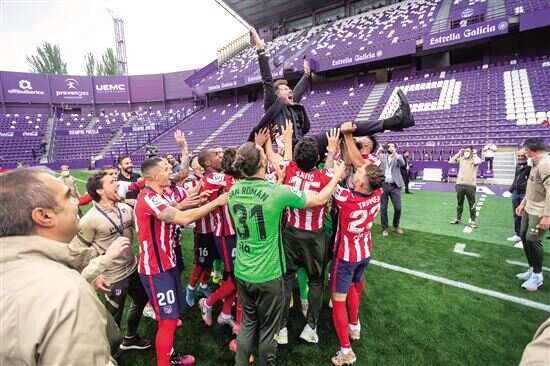 ■马德里竞技队球员在夺冠后将主教练西蒙尼抛向空中。 新华社发 |