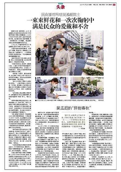 民众冒雨吊唁吴孟超院士 据新华社电 细雨沥沥。23日,吴孟超院士的追思活动在其生前工作的海军军医大学第三附属医院(上海东方肝胆外科医院)举行,前来吊唁者络绎不绝。他们眼泛泪光、脚步缓慢,用