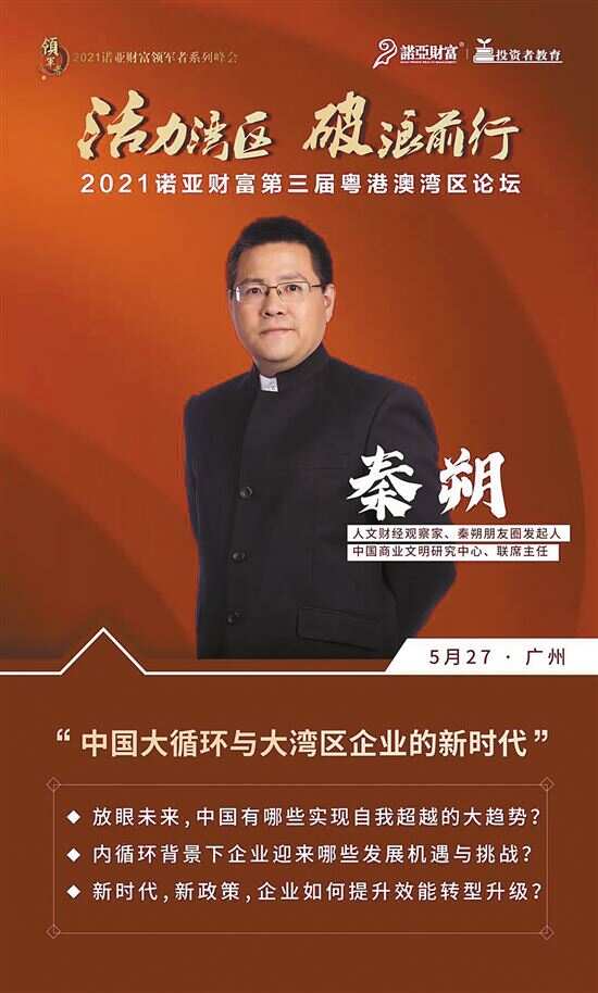 “活力湾区 破浪前行” 特别报道 “十四五”时期,是我国开启全面建设社会主义现代化国家新征程的第一个五年,我国将进入新发展阶段。作为充满活力的世界级城市群,粤港澳大湾区是我国对外开放的前沿阵地,是中国经济发展的重要增长极。“十四五”期间,中国经济如何驭浪前行?粤港澳大湾区又将带来哪些发展新机遇? 5月27日,2021诺亚财富第三届粤港澳湾区论坛将在广州举行,以“活力湾区 破浪前行” 为主题,众多行业大咖将齐聚,探讨新时代中国经济发展可能性以及产业未来发展的活力和韧性。这也是2021诺亚财富领军者系列峰会中的重要组成部分。 根据主流机构的预计,2021年全球经济将增长6.5%,其中中国经济预计将在去年V型反弹的基础上,实现更高的增长。未来,中国经济将着眼长期的高质发展,尤其是粤港澳大湾区作为先行先试的示范区,预计在金融、经济、科创等多产业领域将迎来极速发展。在此背景下,优质的财富管理机构,将成为大湾区推动创新驱动发展的有力支撑,而随着粤港澳大湾区不断提升完善金融服务体系,财富管理机构也迎来新机遇。 为此,在此次论坛中,北京大学国家发展研究院金光金融学与经济学讲席教授、副院长黄益平、人文财经观察家秦朔、源码资本合伙人王星石以及诺亚财富执行董事章嘉玉将分别就“解构十四五规划 探索新机会”“中国大循环与大湾区企业的新时代”“从互联网+到智能+:三横九纵的行业投资机会”以及“2021年市场战略思考与布局”为主题进行演讲,与此同时,诺亚黑钻俱乐部将举行发布仪式,会议还会进行平行分会场的深度沟通会。 随着中国经济发展的新时代,众多投资机会等待被发掘,未来,诺亚黑钻俱乐部也将为所有会员提供更多优质的投资建议。诺亚财富,也将通过强大的研究能力为集团产品研发、筛选和风控保驾护航,并助力客户把握趋势,前瞻布局,实现资产稳健的增长。 欢迎联系诺亚专属理财专家报名,或致电400-820-0025转6,我们会有专人联系您,期待您的参与! (涂波) 议 程 13:00~13:30 签到入场 13:30~13:40 开场大片 13:40~13:50 开场致辞 演讲嘉宾:冯炬文 珠海横琴新区金融和财政局副局长 13:50~14:20 主题演讲:2021市场战略思考与布局 演讲嘉宾:章嘉玉 诺亚控股创始投资人、执行董事 14:20~15:20 主题演讲:解构十四五规划,探索新机会 演讲嘉宾:黄益平 北京大学国家发展研究院副院长 15:20~16:10 主题演讲:中国大循环与大湾区企业的新时代 演讲嘉宾:秦朔 人文财经观察家 16:10~16:50 主题演讲:“从互联网+到智能+”:三横九纵的行业投资机会 演讲嘉宾:王星石 源码资本合伙人 16:50~17:00 主题演讲:诺亚黑钻俱乐部发布仪式 演讲嘉宾:栾奕 诺亚控股品牌市场中心负责人 17:00~18:30 平行分会场深度沟通会 分会场一 主题演讲:诺亚2021夏季投资策略报告会 演讲嘉宾:武林 诺亚正行投资顾问部负责人 分会场二 主题演讲:新环境下传承规划的思路(上半场) 演讲嘉宾:郭亭 方舟信托海外财富规划副总裁 主题演讲:解码海外创新项目(下半场) 演讲嘉宾:李晨曦 诺亚国际高级财富规划经理 分会场三 主题演讲:源码五期基金投资策略解读 演讲嘉宾:景雯娜 源码资本投资人关系负责人 分会场四 主题演讲:长期投资中如何避免做一只火鸡(上半场) 演讲嘉宾:廖振华 睿璞投资研究总监、投资经理 主题演讲:CTA:提升投资组合收益的“魔法棒”(下半场) 演讲嘉宾:何贤发 锐联中国研究部负责人 分会场五 主题演讲:个人投资者如何拥有一家保险公司 演讲嘉宾:张沛 信美相互高客业务部副总经理 分会场六 主题演讲:存量效率时代的投资机会(上半场) 演讲嘉宾:宋冉冉 钟鼎资本美元高级投资者关系经理 主题演讲:中高考改革背景下,我的孩子如何突出重围(下半场) 演讲嘉宾:Lily Li 中成协青少年成长规划认证导师