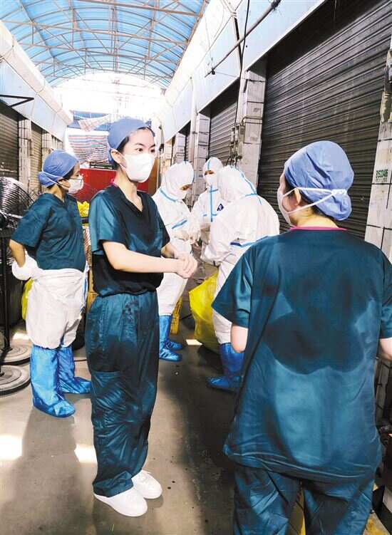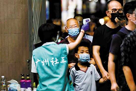 昨晚,广州多个地方继续进行居民核酸检测工作,医务人员承担艰巨任务,当晚广州各大医院医护人员出发支援佛山核酸检测。广州核酸检测现场还有很多来自街道的工作人员、志愿者、社工、警察等帮助维持现场秩序。高温的天气让工作人员湿透了衣背。尽管前来进行核酸检测的居民排了长长的队伍,但现场秩序井然。