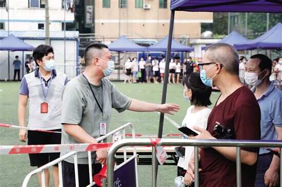 ■昨日,在广州海珠区凤阳街道鹭江球场核酸检测点,市民在工作人员引导下有序地进行核酸检测。从5月30日开始,广州在荔湾区继续核酸筛查的基础上,进一步扩大全员核酸检测范围,区域覆盖至:越秀、海珠全域,以及天河、白云、番禺的重点区域。新快报记者 毕志毅/摄