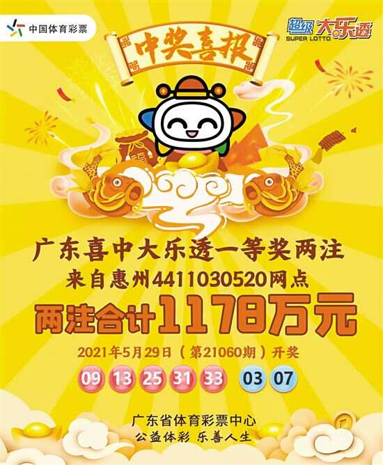新快报讯 记者陆妍思报道 5月29日,体彩大乐透第21060期开奖,当期广东中出2注单注奖金571万余元的基本投注一等奖,落户惠州,中奖彩票是两张选号一样的胆拖票,单票总揽奖金588万多元,如为一人所中,这位中奖者将揽获总奖金1176万多元。 奖池尚余5.09亿元滚入下期 体彩大乐透第21060期的中奖号码为:前区“09、13、25、31、33”;后区 “03、07”。前区号码大小比3∶2、奇偶比5∶0,“13”为隔期开出的跳号,“31”为遗漏15期开出的冷号,同时开出一组同尾码“13、33”;后区开出一小一大的双奇组合。 本期全国共开出8注一等奖。其中,4注为1028万元(含457万余元追加奖金)追加投注一等奖,分落辽宁大连、浙江台州、湖南岳阳、四川成都;4注为571万余元基本投注一等奖,分落广东惠州(2注)、福建宁德、江西宜春。 据核查,广东惠州的2注基本一等奖均花落惠城区麦地路41号首层3号铺的4411030520体彩实体店,中奖的彩票是两张一模一样、“前区10拖+后区1胆2拖”的胆拖票,单票总揽奖金588万多元。如为一人所中,他揽获总奖金1176万多元。 二等奖开出105注,每注奖金6.23万余元;其中45注采用追加投注,每注多得奖金4.99万余元。追加后,二等奖单注总奖金11.23万元。 当期全国销量为3.28亿元,为国家筹集彩票公益金1.18亿元。奖池方面,本期开奖结束后,5.09亿元滚存至5月31日(周一)开奖的第21061期。 上市14年筹集公益金1123亿 5月26日,大乐透“10亿元大派奖”落下帷幕。5月28日,大乐透迎来上市14周年的日子。上市14年来,截至今年5月26日(第21059期),大乐透累计销量超3156亿元,筹集公益金逾1123亿元。这些公益金用在补充全国社会保障基金、教育助学、文化事业、扶贫、体育事业等多个领域。 每花2元钱购买1注超级大乐透,就有0.72元用于社会公益事业。14年来,大乐透购彩者的一张张彩票,一颗颗爱心汇聚,成为能量浩荡的公益场,让爱心持续发酵、让温暖生生不息。 派奖落幕,过完14周岁生日的大乐透征程再启。对于购彩者来说,历经14年洗礼的大乐透被赋予了更深的意义。如今,大乐透正在成为很多人不可或缺的生活娱乐方式、参与公益实践的平台以及为追求个人梦想和实现社会价值的“帮手”。