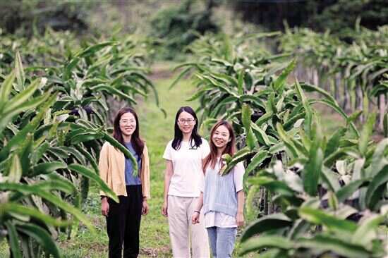 曹景华、张笑喜和胡瀞丹在村里的火龙果基地。 |