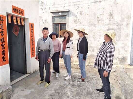 ■曹景华(右二)和胡瀞丹(右三)跟村书记一起入村走访贫困户。 |