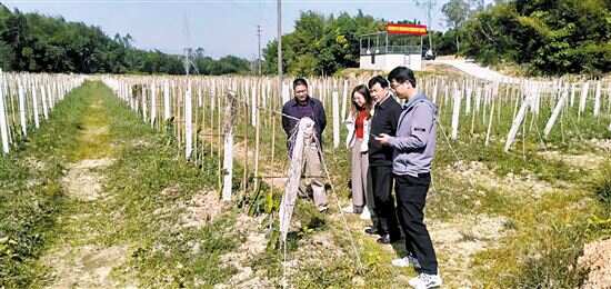 ■胡瀞丹(左二)与驻村干部一起到火龙果基地查看火龙果长势。 |