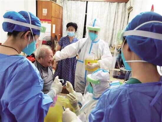 广州市开展大规模的核酸检测排查,无论是烈日下、暴雨中,还是凌晨午夜,都能看见医护人员忙碌的身影,有的人脱下的防护服里满是汗水,脸上被口罩勒出深深的红印,有人双手被汗水浸泡得发白起皱,有人渴得一口气猛灌3瓶水…… ■新快报记者 高镛舒 通讯员 白恬 魏彤 胡颖仪 孙冰倩 “身为医护人员,救死扶伤是职责所在” 5月30日,广州医科大学附属肿瘤医院接到支援荔湾区核酸采样紧急任务,125名医务人员火速集结,前往荔湾区中南街道、海南和海中社区支援中风险地区居家隔离人员入户核酸采样工作。第二天12时,医院派出第三批60余名医护骨干接力支援。 为了减少中高风险地区人员流动,保护社区居民的安全,广州医科大学附属肿瘤医院医护人员逐户走访,上门为社区居民进行核酸检测。荔湾区中南街道、海南和海中社区多为老旧的楼梯楼,还有很多是8层、9层的高楼,隔离衣、N95口罩、手术帽和医用隔离面罩,三十几摄氏度的高温天气里,医护人员全副武装,穿戴着密不透风的防护装备,一步一个楼梯,挨家挨户进行入户核酸采样。刚刚值完夜班,收到通知立马回医院的党员赖琪琪说:“有需要,我们随时就会上!” “身为医护人员,救死扶伤是职责所在,身为党员更要发挥带头作用,义无反顾走向前线。”医院援鄂医疗队队员、护理部副主任周瑛说,“穿上防护服之后就像是在蒸桑拿,但是能为疫情防控贡献一份薄力是我们的荣幸。” “脱下防护服后,一口气喝了三瓶水” “即使有大风扇和义工搬来的冰块为我们降温,但是密不透风的防护服之下,仍然是一直出汗,但都忍住了,最后完成任务脱下防护服后,一口气喝掉三瓶水。”在荔湾体育馆进行核酸检测的广医三院郭俐表示。 虽然遇到了高温和暴雨,但是医护人员们却努力克服着种种困难,坚决不影响核酸检测的进度。工作几个小时下来,他们的衣服早已湿透,但却没有怨言,只有一张张因为完成任务而感到骄傲的笑脸。 “老人们说着谢谢的时候,职业价值感便油然而生” 荔湾区许多小区比较老旧,没有电梯,部分老人出行不便,郭俐等一行五人上门为老人进行核酸检测,三楼、四楼、五楼、六楼,老人们分布在不同的楼层,而因为户外天气炎热,队员们穿着防护服,还要携带采集物品爬楼梯上门采集,几乎全程是泡在被汗水浸透的防护服里。 在荔湾区鹤园小区上门为行动不便老人做核酸的郭俐打趣说道:“还没穿上防护服已经汗流浃背了,穿上防护服后更热了,汗直接往嘴里流,还没办法擦……” 同样遭遇出行难题的,还有在荔湾区的几家养老机构。5月28日,荔湾区昌华街道辖区内的颐寿福寿院、晶辉老人院、岭海老人公寓,老人因行动不便无法到指定地点进行核酸检测。老人公寓分布在不同街区,且需要全手工录入,时间紧、任务重。广医三院以保护好老人为原则,挑选接种疫苗的医护人员上门,累计为养老机构的400多名老人进行核酸检测。 “老人们鼓着掌、竖起大拇指说着谢谢的时候,我们的职业价值感便油然而生,是欢欣和鼓舞,是感动和幸福。”为老人上门采集核酸样本的严诗玉护士说道。