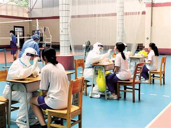 ■广州中医药大学第二附属医院(广东省中医院)医疗队赴荔湾区7所高中为高考生进行核酸检测采样工作。通讯员 查冠琳 |