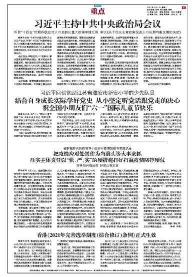 据新华社电 香港特区政府发言人31日介绍,《2021年完善选举制度(综合修订)条例》于当日正式刊宪生效。 发言人表示,这一条例旨在落实全国人大有关决定、全国人大常委会修订的香港基本法附件一