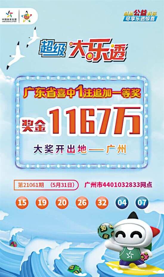 这也是大乐透10亿元派奖结束后,广东连续两期中出大乐透头奖 新快报讯 记者陆妍思报道 5月31日,超级大乐透第21061期开奖,广州上漖村一张54元3期的“6+2”复式追加票中出1注1167万多元追加一等奖。这也是大乐透10亿元派奖结束后,广东连续两期中出大乐透头奖,上期惠州一站点独中2注571万余元的基本投注一等奖。 追加多得518万元奖金 大乐透第21061期的中奖号码为:前区“15、19、20、26、32”;后区 “04、07”。前区号码大小比4∶1、奇偶比3∶2,“15”为隔2期开出的号码,“32”为遗漏10期开出的冷号,同时开出一组连号“19、20”;后区开出一小一大的偶奇组合。 本期全国共开出7注一等奖。其中,3注为1167万多元(含518万余元追加奖金)追加投注一等奖,分落广东广州、上海普陀、河北廊坊;4注为648万余元基本投注一等奖,分落北京丰台、浙江金华、福建泉州、甘肃兰州。 据核查,广东广州的追加一等奖花落洛浦街道上漖村沙滘西路85号的4401032833体彩实体店,中奖的彩票是一张54元3期的“6+2”复式追加票。对比可见,由于采用了追加投注,广州中奖者在单注一等奖方面多拿了518万余元追加奖金。追加投注是大乐透独有的投注方式,在2元基本投注的基础上,多花1元进行追加投注,可多得80%的浮动奖奖金。 头奖奖池滚存5.02亿 当期二等奖开出100注,每注奖金11.55万余元;其中41注采用追加投注,每注多得追加奖金9.24万余元。追加后,二等奖单注总奖金20.80万元。 本期全国销量为3.04亿元,为国家筹集彩票公益金1.09亿元。奖池方面,本期开奖结束后,5.02亿元滚存至6月2日(周三)开奖的第21062期。