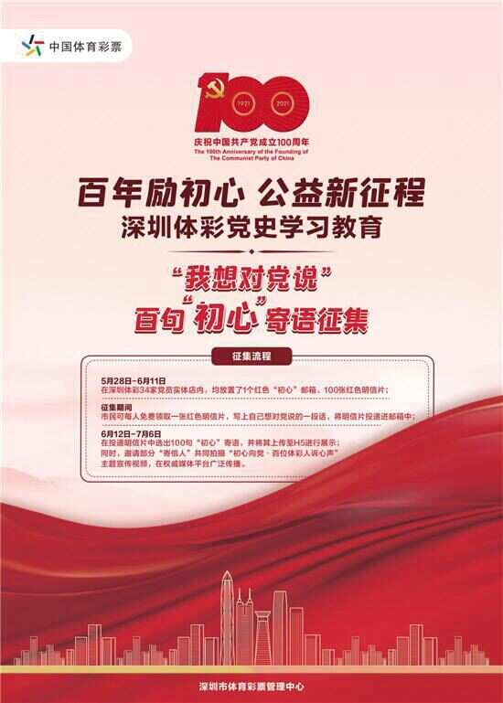 新快报讯 记者陆妍思 通讯员深圳体彩报道 深圳体彩“百年励初心 公益新征程”党史学习教育近日正式启动,首期活动“百句·我想对党说”现已开启,将面向广大市民征集一百句“初心”寄语。征集活动将延续到6月11日。 活动期间,全市30余家党员开办的实体店内和深圳体彩中心兑奖大厅,均放置了红色“初心”邮箱和近100张红色明信片。市民可前往免费领取明信片,写下想对党说的心里话(100字以内),并将明信片投递至“初心”邮箱内。 征集完成后,深圳体彩将选出最情真意切的100句“初心”寄语,并制作成精美H5进行展示分享。同时,将邀请部分“寄信人”,共同拍摄“初心向党·百位体彩人诉心声”主题宣传视频。 红色“信纸”已备好,如果您有心声想“说给党听”,或是想抒发党史学习感悟,欢迎您随时迈入这些党员实体店,提笔挥毫写下心里话吧。