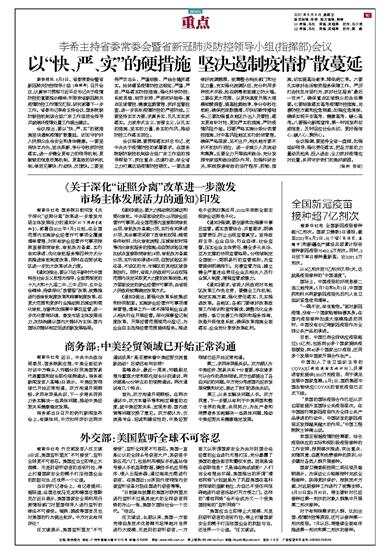 据新华社电 国务院日前印发《关于深化“证照分离”改革进一步激发市场主体发展活力的通知》(以下简称《通知》),部署自2021年7月1日起,在全国范围内实施涉企经营许可事项全覆盖清单管理,对所有涉企
