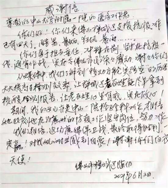 “为荔湾尽一份微薄之力”“谢谢你们!”……广州已进入酷暑时节,最近又赶上雷雨天气,不少市民都感叹“真不容易”,但是战疫一线,众志成城,千千万万个“你我”,正汇聚成强大的力量,那些“小而美”的故事,正是守护家园最美的“音符”。 佛山市民给广州医护来信: “佛山市民深深感动,谢谢你们!” 新快报讯 记者黎秋玲 通讯员彭福祥 梁嘉韵报道 “你们来佛山禅城支援抗疫工作已有四天了。酷暑、暴晒、狂风、暴雨……你们勇于担当重任,冲锋在前,坚守在抗疫一线,通宵作战,实在令佛山市民深深感动,谢谢你们……”这是一封来自佛山市民的感谢信。原来,5月28日下午,广东省支援佛山市大规模核酸检测采样队500人集结完毕,奔赴佛山市祖庙街道和南庄镇等地,开展全员核酸采样工作。连日来,医疗队员们的辛勤付出,佛山市民看在眼里,记在了心上,感动不已,今年60多岁的陈伯,写下了这封感谢信。 疫情发生后,陈伯与老伴一同去家附近的核酸检测点排队进行核酸采样,但由于之前人手不够,需要检测的队伍太长了,上了年纪的他们经不起几个小时的排队等候,来到现场后不得不又原路返回了。 5月28日晚开始,中山大学附属第一医院共派出107名医务人员、8名核酸检测人员以及移动方舱核酸检测实验室支援佛山抗疫。队伍到来后迅速制定最优工作流程,大大提高了核酸采样的工作效率。市民排队时间从3小时减少到2小时,从2小时减少到1小时,甚至更短…… 得知中山一院医疗队支援且排队时间大幅缩短的消息,陈伯与老伴又再次来到核酸采样点,并在较短的时间内便完成了核酸采样。 “医务人员裹着厚厚的防护服,在烈日酷暑下马不停蹄地工作,就像一颗螺丝钉,牢牢钉在岗位上!”陈伯说,在现场,连日来见证了医务人员即使经历酷暑、风雨,也毫不动摇的奉献精神,非常感动。 说起写感谢信的初衷,陈伯说,看着这些年轻人的面孔,禁不住也想起了同样是医务人员的女儿。于是,6月2日,在医疗队返回广州后,陈伯提起笔,一气呵成写下了这封感谢信,“你们勇于担当,坚守在一线,通宵作战,实在令佛山市民深深感动,谢谢你们!”