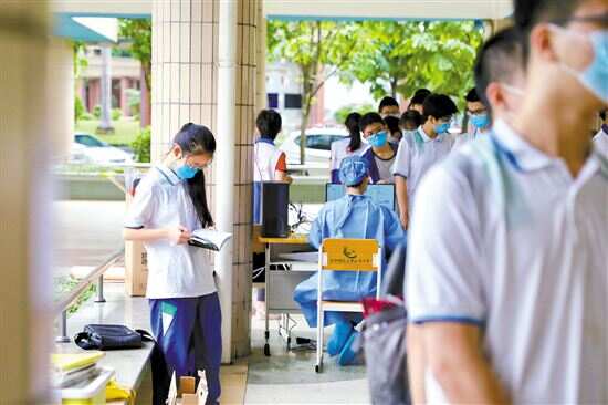 加把劲 ■昨日,华南师大附中高三学生进行全员核酸检测,为即将到来的高考冲刺,有学生在核酸检测的间隙不忘“充电”。新快报记者 夏世焱/摄