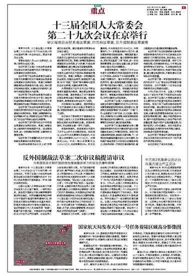 为我国依法反制外国歧视性措施提供有力的法治支撑和保障 据新华社电 十三届全国人大常委会第二十九次会议7日下午举行第一次全体会议,听取了全国人大宪法和法律委员会副主任委员沈春耀作的关于《中华