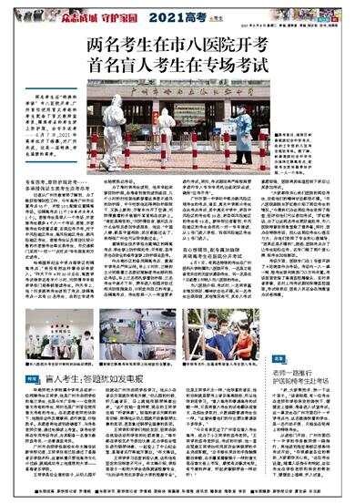 两名考生在“特殊的考场”市八医院开考、广州首位使用盲文考卷的考生配备了盲文教师监考员、隔离考点的考生穿上防护服,由专车送考……6月7日,2021年高考拉开了帷幕,对广州来说,这是一届特殊,却也温