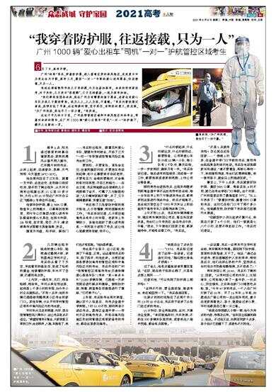 广州1000辆“爱心出租车”司机“一对一”护航管控区域考生 6月7日,高考开锣。 广州“的哥”肖兵,穿着防护服,进入荔湾区芳村高风险区,炎炎夏日中为考生全天守候,高考三天,提供“一对