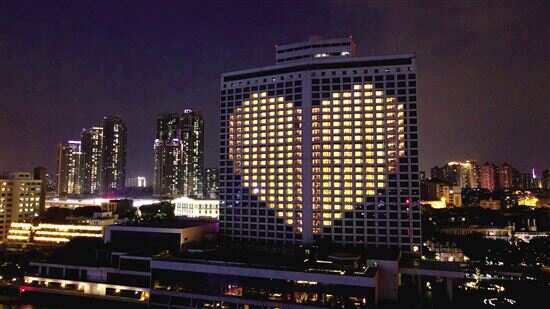 ■昨晚,广州白天鹅宾馆靠江的多间客房亮灯,组成一颗“爱心”,以此为荔湾打气,为广州加油。新快报记者 夏世焱/摄