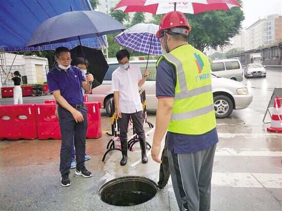 ■天河区水务局领导在华南师范大学南门前现场检查研判积水风险点。 |