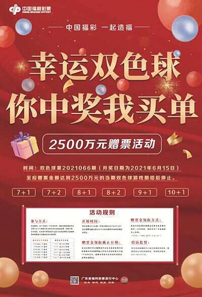 新快报讯 记者陆妍思 通讯员莫冠婷报道 为回报广大彩民对福彩事业的支持,广东省福利彩票发行中心将于6月15日(双色球第21066期)起,在全省范围内(不含深圳市)开展“幸运双色球,你中奖我买单”2500万元赠票活动。活动至应赠票金额达到2500万元的当期双色球游戏期结后停止。彩民朋友可通过6种方式复式投注参加活动。 ● 怎样参与? 6种复式投注 活动期间,在全省范围内(不含深圳市)福彩销售渠道采用且仅限于“7个红球+1个蓝球(7+1)、7个红球+2个蓝球(7+2)、8个红球+1个蓝球(8+1)、8个红球+2个蓝球(8+2)、9个红球+1个蓝球(9+1)和10个红球+1个蓝球(10+1)”六种复式投注购买双色球游戏彩票(倍数不限)且中奖的,在兑取中奖奖金时以返还与该张彩票投注金额相等的购票金方式赠送该张中奖彩票。 复式投注方式种类 对应的赠票金 7个红球+1个蓝球(7+1) 赠14元*倍数 7个红球+2个蓝球(7+2) 赠28元*倍数 8个红球+1个蓝球(8+1) 赠56元*倍数 8个红球+2个蓝球(8+2) 赠112元*倍数 9个红球+1个蓝球(9+1) 赠168元*倍数 10个红球+1个蓝球(10+1) 赠420元*倍数 ●怎样领取赠票金? 活动期间,在全省范围内(不含深圳市)福彩销售渠道采用指定6种复式投注购买双色球游戏彩票(倍数不限)且中奖的,赠票领取方式详见广东省福彩官网(http://www.gdfc.org.cn/)。 ●赠票金领取期限: 活动结束之日起7个自然日内 广东省福彩中心提醒彩民:单张中奖彩票的赠票金只限该张彩票兑奖时一次性领取。在活动有效期内符合赠票条件且在兑奖有效期内的彩票最后获取赠票截止时间为活动结束之日起7个自然日内,逾期未领视为自动放弃领取该赠票金。