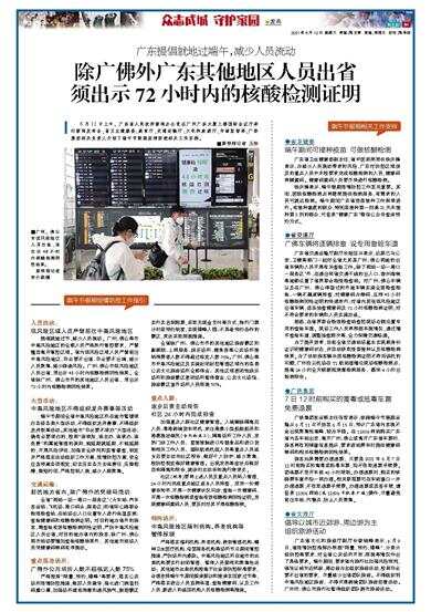 除广佛外广东其他地区人员出省 须出示72小时内的核酸检测证明
