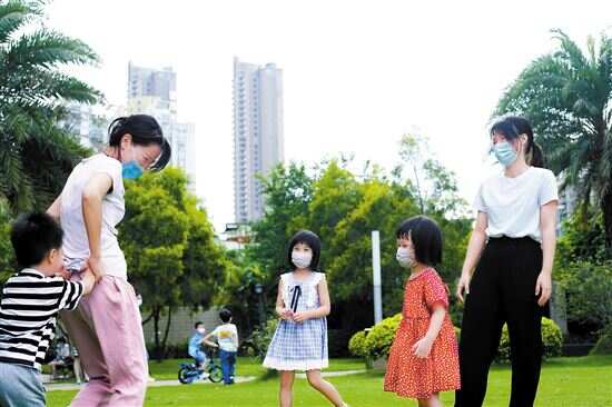 ■6月14日,在沙园街中海橡园小区,在家隔离了十几天后,小朋友终于可以在楼下花园玩耍了。新快报记者 龚吉林/摄 |