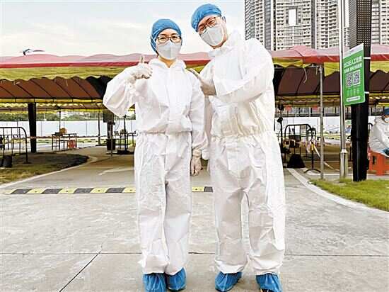 ■“90后”党员夫妻曾智威与何凌志在核酸检测点工作现场。 |