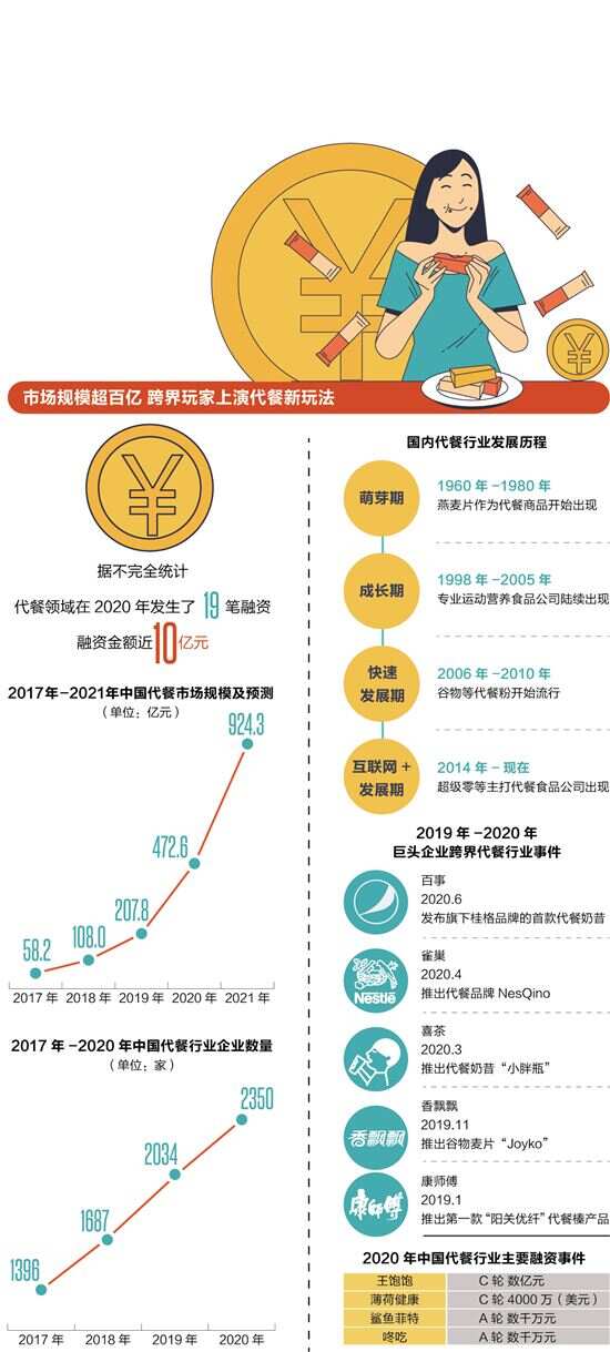 然而隐忧也不少,虚假宣传、假冒伪劣等问题成行业发展“拦路虎” 管住嘴,迈开腿”是大家熟知的减肥两板斧。但在饮食和运动两个方面选择,前者的呼声可能更高,这也大大刺激了代餐食品市场发展。据天猫平台数据显示,代餐食品消费人数近三年增长78%,主打“0糖0脂”、“断糖饮食套餐”等新晋网红代餐食品的市场规模已增长超过30倍。然而,代餐行业百亿级市场规模背后,也有不少的隐忧。虚假宣传、假冒伪劣等问题成为了代餐行业发展的“拦路虎”。 ■策划 新快报记者 罗韵 ■统筹 新快报记者 梁彧 ■采写 新快报记者 张磊 ■制图 廖木兴 体重管理等需求 推动市场规模迈向百亿级 数据显示,目前我国18岁及以上成人超重率为30.1%,肥胖率为11.9%。其中,国内肥胖人群、糖尿病患者人数超过1.1亿,而食用代餐已经成为肥胖人群减重的重要方法。 回溯代餐食品的发展,我们可以发现,当前代餐食品已经从早期针对宇航员、运动员的单一功能性食品向当前以健康食材为原料的食品演变;受众已经从专业的运动员向普通大众过渡;同时为了迎合消费者的需求,代餐食品在口感、口味、品类甚至工艺上不断进步,开发了包括零卡咖啡、代餐粥等各类代餐食品。 具体来看,代餐行业市场格局主要是以麦片、代餐粉、蛋白棒及肉制品等品类为主。用户需求的增长推动行业市场规模持续扩大。数据显示,2017-2020年,中国代餐市场规模呈持续增长的态势,年复合增长率为68.8%,其中,2020年中国代餐市场规模达472.6亿元。艾媒咨询分析师认为,随着代餐食品的种类不断丰富,市场的消费力得到了充分释放,但中国的市场规模与其他发达国家相比依然有一定的差距。 巨大的市场空间引发了投资机构的狂欢。艾媒数据显示,中国代餐行业存续企业数量从2016年的1082家发展到2020年的2350家,增加了一倍。2019-2020年,知名茶饮企业康师傅、喜茶、雀巢、百事先后入局代餐,此外,初创企业王饱饱、ffit8、 WonderLabs Smeal等切入代餐的不同细分产品市场获得差异化竞争优势,从而获得资本青睐并走红网络。 事实上,近年除了营养代餐类创业公司获得资本的看好与加持外,汤臣倍健、良品铺子、百事、伊利、家乐氏等快消品巨头也纷纷布局中国的“营养健康代餐”市场。据不完全统计,代餐领域在2020年发生了19笔融资,融资金额近10亿元。 95后更偏爱代餐 麦片是消费者最爱 消费升级背景下,大众对自身的营养摄入及身材管理的追求越来越高,轻断风、代餐风渐趋风潮,主打低糖、减肥、轻食的代餐粉步入大众视野。据CBNdata数据,95后在代餐产品上花费金额较其他人群更高,80-90后对谷物型零食消费需求相对更高,85后、95后对抗糖需求明显提升。“营养保健”、“美容养颜”及“减肥塑形”是消费者购买代餐产品的主要动机。 数据显示,代餐产品消费者中有超过七成偏好麦片,其次是代餐粉,占比45.4%。而在渠道方面,46.9%的受访用户主要通过线上渠道购买代餐粉,并且在选购产品时主要关注代餐粉的口味及营养。在网购这部分群体中,超过三成为年轻消费者并主要以女性为主。“酸奶”、“果干”及“坚果”位列中国代餐粉消费者偏好口味T0P3。 在月均支出方面,受访用户在代餐产品上的月均支出主要集中在150-200元,而200元以下的用户占比超过一半。艾媒咨询分析师认为,代餐粉种类较多,一些传统代餐粉如芝麻糊制作工艺普遍难度较低,这就使得市面上多以平价代餐粉为主,消费门槛较低,加上代餐粉多为早餐场景,因为比较受白领们欢迎。 从用户分布来看,目前代餐的消费者基本遍布全国,其中以广东、广西等沿海地区用户分布最多。 艾媒咨询分析师认为,由于代餐粉网购渠道比例较高,并且用户多为成长于互联网的年轻一代,因此商家可以借助小红书、抖音、快手、知乎、B站等内容平台进行全方位的内容宣发,培养消费者的品牌心智。