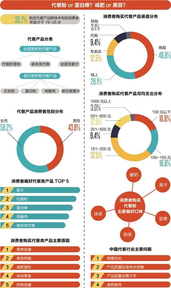消费需求不断拓宽 代餐潜在用户群体较大 行业在短时间内受到资本和消费者双重青睐,也让代餐市场很快出现了阶段性王者,并形成了三足鼎立的竞争格局。目前,代餐市场的主要参与玩家包含本土新兴代餐品牌、外资代餐品牌和传统食品品牌。 具体来看,新兴代餐品牌ffit8、王饱饱、鲨鱼菲特、超级零等品牌凭借差异化打法在不同细分市场站稳了脚跟;Smeal、Huel等外资品牌则通过与京东、天猫等电商平台合作分得了国内市场一定份额;康师傅、百草味、中粮等传统食品品牌也积极紧跟风口,纷纷推出了代餐产品前来分食蛋糕。据CBNData数据显示,2019年中国代餐品牌数量为2837个,2020年则直接增加到3540个。 在代餐众多产品中,消费者对于蛋白棒的推荐意愿较高。数据显示,79.3% 受访用户对蛋白棒的发展前景整体保持看好的态度,仅有两成多的用户持中立态度。艾媒咨询分析师认为,蛋白棒的产品形状及包装比较类似于零食,消费场景可以突破替代正餐,因而可以通过社交渠道进行推广,未来零食化、功能化可能会成为蛋白棒的发展方向。 随着消费升级步伐加快,消费市场个性化和多元化的消费趋势更加明显。数据显示,38.02%的受访用户对代餐食品的需求点主要是体重管理,其次是美容、睡眠、增肌、防脱发等多种功效需求。此外,代餐产品的消费场景除了替代正餐、体重管理等功能性消费,还发展出代餐零食化的消费场景。 数据显示,当前有43.9%的受访用户没有购买过代餐产品,其中有45.5%表示未来会购买代餐,超过三成受访用户持中立态度,这也在一定程度说明代餐潜在用户群体较大。艾媒咨询分析认为,代餐行业的消费需求及消费场景都在不断拓宽,因而对行业初创企业来说,不断挖掘垂直细分消费场景才是成功突围的关键。 虚假宣传、假冒伪劣 成代餐行业发展“拦路虎” 市场体量百亿级的同时,当前代餐行业仍存在缺乏行业强制标准、虚假宣传、微商渠道销售假货等乱象。2020年某省份12315平台共接收涉及代餐食品的投诉45件,同比增幅为80%。投诉主要反映:代餐食品虚假宣传,虚标营养成分,以“假全麦”“假无糖”“假低脂低卡”的噱头欺骗消费者等。 当下消费者盲目而迫切的减肥需求与潜力成就了众多代餐微商品牌,如佐丹力159、木婉清、脂老虎等代餐品牌,然而部分代餐产品在微商渠道销售时,往往夸大宣传吸引消费者。此外,部分知名品牌在销售代餐时也会出现类似的问题。 另一方面,代餐行业假冒伪劣和质量标准未明确问题突出。2020年7月,深圳市消费者协会抽检10款代餐粉,就出现了多批次检测品实测值与标签标示值不符、产品不符合食品摄入标准等问题。业内专家分析认为,缺乏严格的标准,导致代餐食品市场鱼龙混杂,是产品营养不均衡、配方不科学、质量良莠不齐等问题出现的根本原因。 消费者方面也更看重市场部门对代餐行业的事前监管。数据显示,六成左右受访用户认为代餐行业需要完善代餐类产品质量标准,并加强对线上代餐食品经营的准入审核监管,此外提高代餐消费者对产品真伪的辨别能力以及监管机构及时曝光行业骗局也尤为重要。 艾媒咨询分析师认为,国家加速代餐食品国家标准出台,市场监管部门全面优化监督事前、事中、事后监管机制,消费者对产品辨别能力提高,选购代餐产品时要谨慎对待经营者的广告宣传,这都将有力推动行业规范化发展。 ■参考数据:艾媒咨询《2021年一季度中国代餐行业发展及市场调研分析报告》