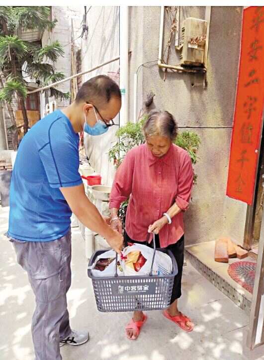 ■刘智贤在石围塘街道为老年住户送货上门。 |
