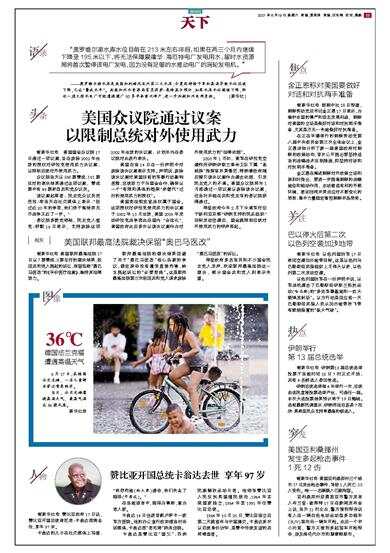 据新华社电 美国国会众议院17日通过一项议案,旨在废除2002年生效的授权对伊拉克使用武力决议案,以限制总统对外使用武力。 众议院当天以268票赞成、161票反对的表决结果通过这项议案,