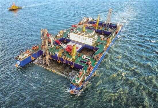 ■6月18日,中交一航局的沉管运输安装一体船搭载E10管节浮运前往珠江口伶仃洋安装现场。新华社发 |