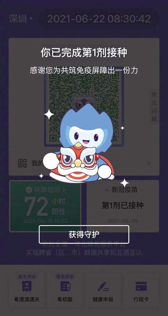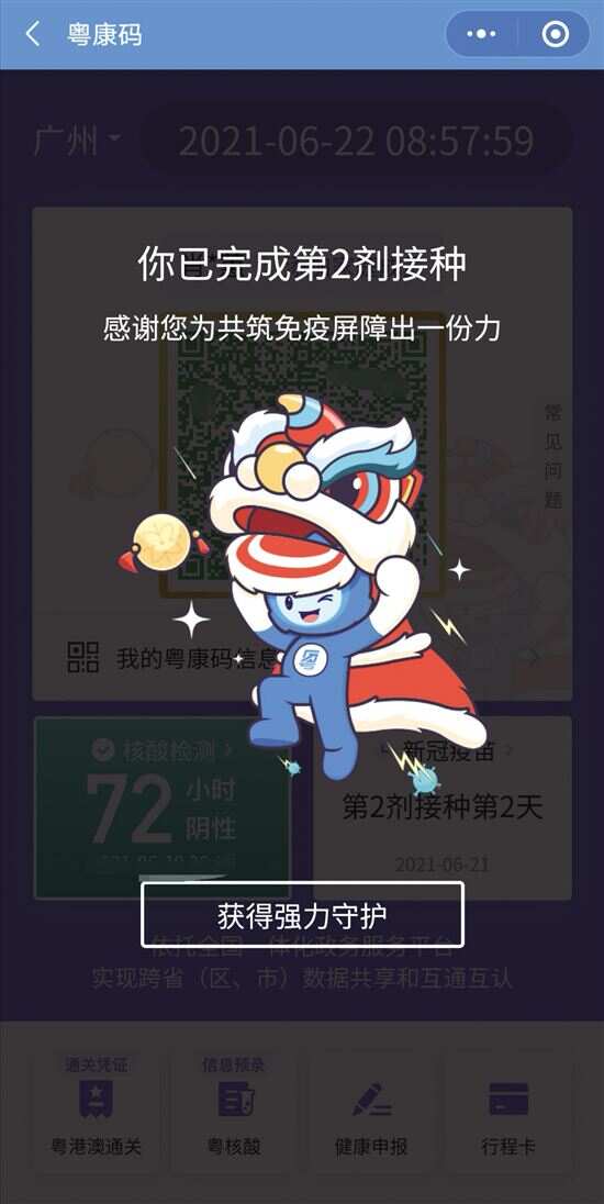 新快报讯 记者曾贵真报道 粤康码新皮肤上线啦!昨日,接种了新冠疫苗的市民打开“粤康码”小程序后,发现多了一只可爱霸气的小醒狮。 接种完新冠疫苗第一针,“粤康码”右边将显示一只蓝色小狮子头像,“粤康码”四周镶嵌蓝边。市民点击小狮子图案后,会出现小狮子图案以及“你已完成第1剂接种 感谢您为共筑免疫屏障出一份力”“获得守护”的文字。 接种完新冠疫苗第二针,“粤康码”中间会出现一只红色小狮子,“粤康码”四周镶嵌金边。市民点击小狮子图案后,会出现小狮子图案以及“你已完成第2剂接种 感谢您为共筑免疫屏障出一份力”“获得强力守护”的文字。