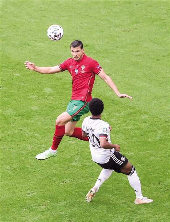 ■6月19日,葡萄牙队球员鲁本·迪亚斯(上)在比赛中头球解围。新华社发 |