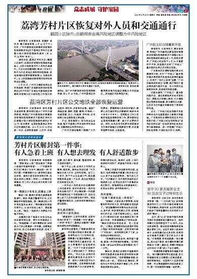 新快报讯 记者黎秋玲 通讯员穗交通宣报道 新快报记者从广州市交通局获悉,根据《广州市新型冠状病毒肺炎疫情防控指挥部关于荔湾区芳村片区调整分级分类防控措施的通告》(第22号)有关要求:全面恢复荔湾
