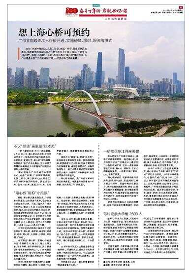 广州首座跨珠江人行桥开通,实施错峰、限时、限流等模式 地处广州新中轴线上,北起二沙岛、南至广州塔,首座世界跨度最大、宽度最宽的曲梁斜拱人行桥于昨日上午竣工通行,并获芳名“海心桥”,昵称“小