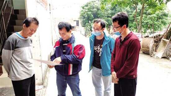 ■何央(左二)与脱贫户核对帮扶落实情况。 |