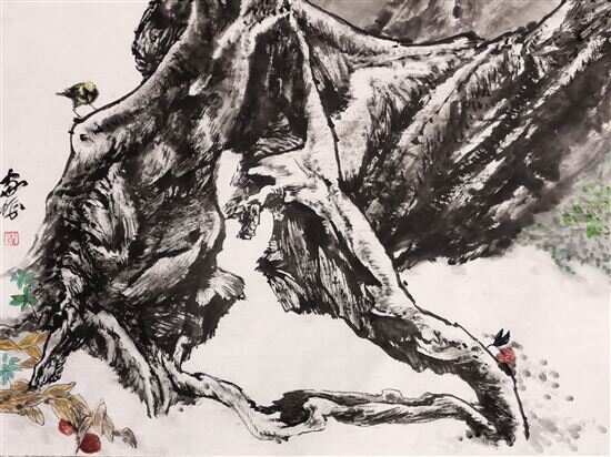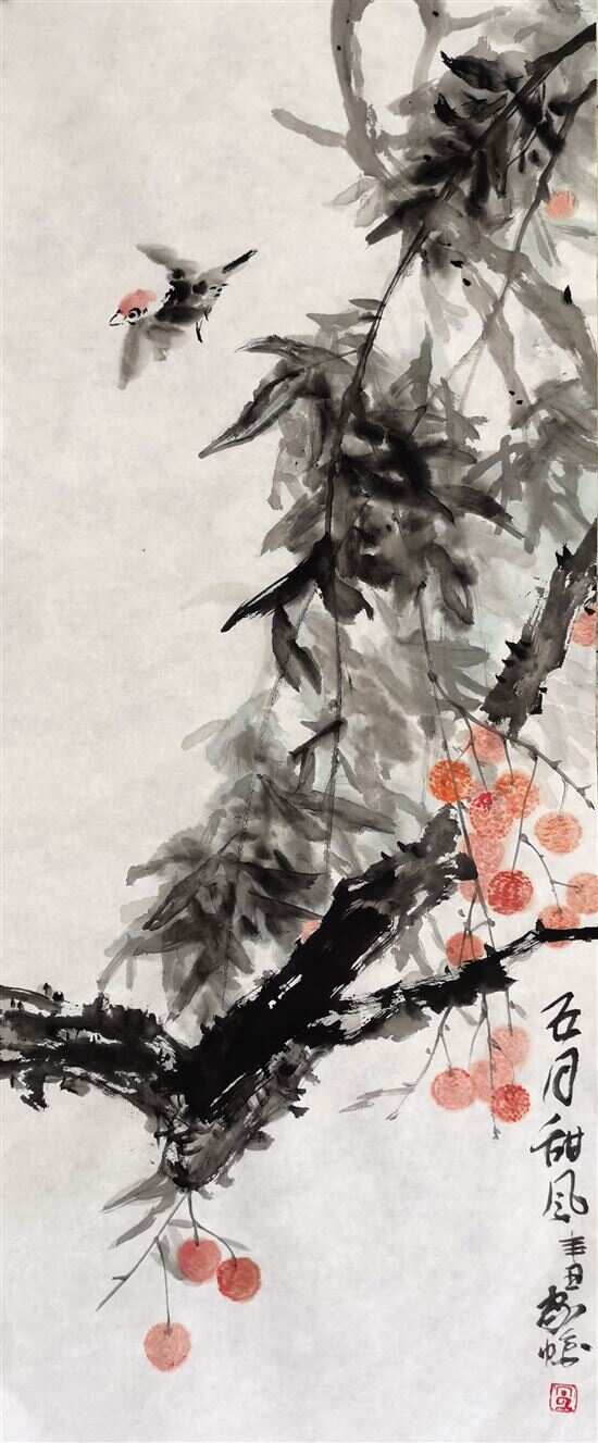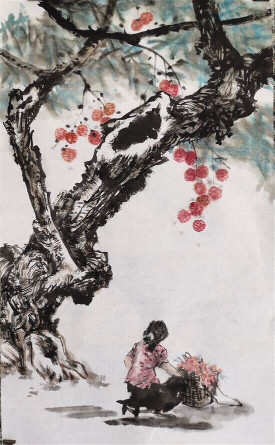 ■朱积 说到荔枝,我想打个比喻——她是身着红色羽衣的仙子:美丽、高贵、大方。乍一看,就让人心生爱怜。她的心形果形,鲜红的色泽;她的晶莹润滑的果肉;她的清冽、香甜、清润的味道……千百年来,不知多少权贵、文豪画圣、才子佳人、平民百姓为她倾倒。在中国的文化里,牡丹是花之王,而果之王,非荔枝莫属! 让我们静下心来,听听历史上一些名人的心声。 流传最广、妇儒皆知的写荔枝诗句,当属苏轼的“日啖荔枝三百颗,不辞长做岭南人”和杜牧的“一骑红尘妃子笑,无人知是荔枝来”。史称,苏轼是最会吃的,总是变着法子找好吃的。当遇上荔枝,似乎成了最爱:岭南就岭南吧,虽然远离政治文化中心,是蛮荒之地,但有荔枝,久住也无妨。 蔡襄,曾作《荔枝谱》,称荔枝“其于果品,卓然第一”。张九龄是广东人,对荔枝当然熟悉,作《荔枝赋(并序)》,语气不置辩“百果之中,无一可比”。天,堂堂宰相,为了家乡的荔枝,也不计较什么身份了,讲了一句斩钉截铁的话。还有宋珏、李时珍、丘逢甲,更有近现代的一众文人词客等等,对于荔枝,统统都嫌世界上的溢美之词不够用了。 对荔枝的偏好,何止这些文人呢。皇帝更像是着了魔。 史载,一些皇帝视荔枝为稀罕之物,每年荔枝成熟季节,以荔枝作为赏赐品,奖赏得力的近臣,每次奖赏还“抠”得很。一是范围小到几个大臣,二是每人只赏一两颗。据说,那得赏的臣子,手持荔枝,昏昏乎乎回家,遍叫亲朋来观赏,凡两三天不肯啖。与今天茂名人一人一次可啖一两斤荔枝比,简直天壤之别啊。 这只是一般帝皇的作派。对于“文艺”皇帝宋徽宗和“爱情鸟”皇帝唐玄宗,自又有突出表现。唐玄宗就略了。宋徽宗因爱荔枝,竟命臣子想办法把荔枝移植到宫苑里。不仅如此,还画上了荔枝,至今成了国宝。 面对荔枝,画家们似乎,更痴。齐白石画了五十多幅荔枝,画里大书“知果实之味,唯荔枝最美”之类。须知,他画的是湖南荔枝,果型味道和广东荔枝比,那是相差很多“里程”的,和茂名的桂味荔枝比,那是要“取消藩号”的。除白石老人外,居廉、叶绿野、陈永锵等名家,也都表达了对荔枝的称颂。 茂名盛产荔枝。种植历史已有二千余年,现在还存有几处千年荔枝园。由于这个传统,上世纪八十年中后期,茂名市委市政府组织适宜的地方大力种植荔枝,面积达135万亩,年产量50万吨左右,年售果产值约53亿元,是茂名农民一笔不小的收入。昔日省里有位领导曾驱车荔枝林两个半小时,还在荔枝林里,不禁感叹:“你们不要叫荔枝园了,这是荔枝海啊”。 因为工作关系,更因为我是茂名人,和荔枝又有别样的渊源。对荔枝的种植和市场建设与营销,写过文章,拍过宣传片,出过力。前几年,因组织广东省十几位国画名家到茂名两处千年古荔枝园写生创作,我也跟着做了尝试。之后,我又多次与本地画家到荔枝园里写生、研究,慢慢地对荔枝的果、叶、枝、干、根,以及文化意蕴有了一些了解和体会。 你看,由于机缘巧合,我从种荔枝、卖荔枝、加工荔枝,到写荔枝,又到画荔枝,磕磕碰碰,断断续续,几十年之后,还是断不了这份荔枝情缘。 人生如果有几份美好的话,这也算一份吧? 创作感悟 以创作的态度来对待写生 这是一幅写生习作。那天,面对这棵一千三百年的古荔枝树,我深感震撼:她既沧桑,又挺拔!一千多年的风吹雨打,虫咬刀砍,她仍风姿飒飒。这样顽强的生命力深深打动了我。为表现出这种生命力,我决定只画树的主干,并决定采用线条来塑造形象。仔细观察树身的纹理后,我很快找到了线条的“旋律”。 可画好后,左看右看,近看远看,觉得没有表现充分,心里的话还未说出来。虽然是写生,面对这种特殊形象,我想把话说完整。可看画面,树本身已画得比较充分了。我只好起身到周边走走来找灵感。走到园边,看到几株山芋很茂盛,电击般来了灵感,立马回去,几笔大写意画了一个块面。这样,线条与块面、古老与新生,形成强烈对比。赞颂生命力的意蕴基本表现出来了。但意犹未尽,于是我又采取了落款长题的办法,把画面以外的话说出来,拓展了画的内涵。意境也更突出了。 写生,也要注意让细节表现意蕴 也是一棵古荔枝树。那个奇特的树头,一下抓住了我:岁月如歌,让人缅怀。于是,我就只画树头部分。为了画面感强,我把树根的组合、取舍作了适当处理。画时,借鉴了山水技法和构图形式。为了增强“岁月如歌”的意蕴,我在根部添了熟透落地的荔枝,在左上黄金分割线上,添了一只小鸟,小鸟正歪着头俯视那颗落地的荔枝。缅怀之情弥漫画面。 写生,在丰富繁杂里留出透视“窗口” 这是一幅海边写生稿。渔港里停满了船。我选了其中“头尾对停”的两条船来画。因是第一次画这种渔船,我就尽量把不影响画面的小物件都画进来了。但有三条,我始终把握好。一是繁杂里留出透视“窗口”;二是繁简与高低适当调整;三是曲线与直线、线条与块面,要有机统一在画面里。为了这个,画完两条船后,我又用“方正”的块面加画了一条“意象化”的工作船。船上面添画了一群鸟。一些人认为这后加的船和鸟不好。实际上,正是加了它们,才使前面的主角生动起来。同时,也正是加了它们,才把观者的视线引向主角,并把透视的目光引向前方。 初步学习,体会肤浅,请方家指教。 评论 朱积的《五月》画作,虽然呈现的是“卖荔姑娘”的背影,但全景环视之下,让
