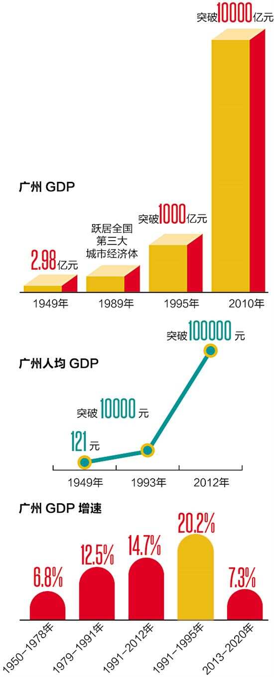 从250万到1867万多人,从3亿元到超2.5万亿元,从121元到13.5万元 从一穷二白到经济强市、从百废待兴到活力充沛、从温饱不足到人民幸福……风雨百年路,在中国共产党的坚强领导下,广州从新中国成立初期人口不足250万人发展成为一个拥有1867.66万常住人口的国家中心城市和综合性门户城市;经济总量从不足3亿元提高到超2.5万亿元,按可比价格计算,比1949年增长1872倍;人均地区生产总值从121元提高到13.5万元,比1949年增长270倍;城乡居民年人均可支配收入从不足200元分别提升至城市居民的6.8万元和农村居民的3.1万元。 ■新快报记者 王彤 通讯员 穗统宣 李俊 1 1921-1949年 风雨飘摇的旧广州 1949年人均GDP仅121元 20世纪20年代,广州成为中国革命运动的重要活动地,随着两广革命根据地的统一和巩固,广州社会秩序渐趋稳定,近代工业体系初步建成。 粤汉铁路1936年建成,公路连接省内和赣湘桂闽等邻省区,创办民航事业,商业随之发展,市场活跃,兴建和扩建一批酒楼、商店、戏院等,形成惠爱路、上下九路和西壕口3个商业区。 1937年抗日战争全面爆发,广州遭到轰炸,于1938年被日军占领,广州社会经济遭受严重破坏。新中国成立前,广州金融紊乱,物价暴涨,民族工业备受摧残,生产无法维持,1949年全市工业总产值比1936年下降25%,44.7%的工厂歇业停工、32.4%的工厂半停工。 新中国成立时,广州经济基础薄弱,1949年,全市地区生产总值(GDP)为2.98亿元,人均GDP为121元。产业结构基本“三分天下”,GDP中第一、二、三产业占比为27.37%∶33.02%∶39.61%。产业发展弱小,农业增加值0.82亿元;工业增加值仅0.96亿元,工业化程度低;商品短缺、种类单一,社会消费品零售总额仅为1.77亿元。城市基础设施落后,近半的村未通汽车。科教文卫衰败,普通小学、中学在校生不足19万人,医疗卫生技术人员仅0.5万人,医院床位不足3500张。 2 1950-1978年 探索前行的新广州 基本实现社会主义初步工业化 1949年10月14日,广州解放,在中国共产党的领导下,开始了城市发展的全新阶段。新生的人民政权在政治上逐步巩固的同时,开展对生产资料私有制的社会主义改造,通过制订国民经济和社会发展五年计划,逐步进入社会主义工业化和现代化建设时期。 在这个阶段,广州社会主义经济基础初步建立,为全面进行社会主义建设奠定了良好基础。“一五”计划顺利完成,国民经济迅速恢复,但此后并没有一帆风顺。发展道路虽然曲折徘徊,但广州1958-1978年20年间工业化发展成就显著,三次产业结构调整为11.67%∶58.59%∶29.74%,工业占比大幅上升,农业占比快速下降,基本实现了社会主义初步工业化。1978年,全市GDP为43亿元,按可比价格计算,与1949年相比增长13倍,年均增长9.2%,人均GDP为907元,年均增长6.8%。 3 1978-2012年 改革前沿的活力广州 GDP从第八位升至第三位 成为“先富”地区 1978年12月,党的十一届三中全会胜利召开,乘着改革开放的春风,广州作为国家首批沿海开放城市,以“敢为天下先”的改革精神闯出一条新路、好路,经济社会发生了翻天覆地的变化。 1979年—1991年是广州改革开放起航阶段。这一阶段,广州作为全国改革开放先行一步的试验区,在各个领域进行改革开放探索。比如在生活品领域,1978年底广州就率先开放水产品市场,打破长期以来所有商品由政府指令性定价的格局,逐渐带动蔬菜、生猪等其他农副产品价格逐步放开;在工业品领域从1980年起逐步放开小百货、小五金等小商铺价格,至1984年日用工业品价格全部放开,1984年社会消费品零售总额达到54亿元,比1979年增长1.6倍。 这一时期广州经济突飞猛进,改革开放初期广州经济总量在全国主要城市中居第八位;1989年,广州跃居全国第三大城市经济体。1991年全市GDP为386.67亿元,1979-1991年GDP年均增长12.5%,增速快于全国平均水平,是当时全国经济最活跃和增长最快的城市之一。人均GDP增至5956元,1979-1991年年均增长12.5%。呈现二、三产业并驾齐驱之势。城镇、农村居民人均可支配收入分别增至3124和1736元,居全国前列,温饱问题基本解决,广州很快成为全国“先富起来”的地区之一。 1992-2012年是广州改革开放加速发展阶段。这一时期以1992年邓小平视察南方并发表讲话为引领,中国的改革开放扬起新的风帆,同年10月党的十四大确立了社会主义市场经济体制改革目标,广州市也进入新的发展阶段。 1995年,广州GDP突破千亿元,达1260.31亿元,1999年突破2000亿元,2002年突破3000亿元,2004年突破4000亿元,从2005年开始每年上升一个千亿级台阶,至2010年,广州GDP突破1万亿元,随后每年增加超千亿元,至2012年达1.37万亿元,在全国主要城市中继续稳居第三位。 1991-2012年广州GDP年均增长达14.7%,比前一阶段高2.0个百分点。其中“八五”期间(1991-1995)GDP年均增速高达20.2%。1993年人均GDP突破1万元,居全国主要城市前列,2012年突破10万元,达107055元;城镇、农村居民人均可支配收入分别增至38054和16789元,比1991年分别增长11.2倍和8.7倍。 4 2012年至今 高质量发展的实力广州 综合性门户城市能级提升 2012年党的十八大召开,标志着中国进入全面建成小康社会的决定性阶段,开启了中国特色社会主义新时代。这一时期,广州经济持续稳定高质量发展,群众获得感、幸福感、安全感显著提升。 2013-2020年,广州GDP年均增长7.3%,城镇、农村居民人均可支配收入年均分别增长8.6%和10.3%,老城市不断焕发新活力。 广州综合性门户城市能