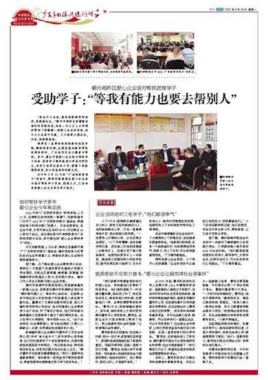 潮州湘桥区爱心企业结对帮扶困难学子 “我也不太会说,就是很感谢党和政府,很感谢企业。”潮州市湘桥区铁铺镇坑巷村村民陈伯说,他的一双儿女上大学期间得到了铁铺镇一家爱心企业的资助,如今女儿在高
