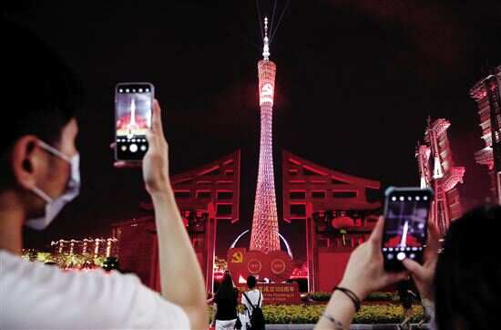 即日起至7月4日每日19:00-23:00整点 进行“奋斗百年路,永远跟党走”主题灯光演绎 夜幕下,华灯璀璨,红动广州。广州市七一“奋斗百年路,永远跟党走”主题灯光演绎联动开启亮灯,党的百年历程在宏大光影背景中徐徐展开。即日起至7月4日,每日19:00-23:00整点,广州将进行主题灯光演绎。 珠水之上,共赏明珠。以广州塔为中心,琶洲西区组团、沿江路24栋组团、中信广场、珠江新城CBD组团、珠江九桥、海珠广场等为重点,珠江沿岸700栋建筑和20公里岸线为长卷, 80多万盏灯光熠熠生辉。 声、光、电交错中,时空也被高度浓缩:一道道世纪之光自楼底向上升起,宛如礼花绽放,数字从“1921”开始不断跳转;随后跨江九座桥梁灯光犹如红色足迹逐渐汇聚到广州塔,点亮寓意2021的广州塔灯光;由广州塔为指挥棒触发并引领整体演绎,演绎内容以广州塔、中信大厦、沿江路24栋建筑媒体立面、琶洲人工智能和数字经济试验区建筑媒体立面为具象呈现载体,各建筑、桥梁同时配合营造氛围。 值得一提的是,广州新老“最高建筑”地标——中信大厦与广州塔通过光影隔空交流,象征着改革开放初期与改革开放成果的对话;沿江路24栋与琶洲人工智能和数字经济试验区建筑景观对应,象征着老城市新活力的对话。 沉浸在浓郁的节日氛围里,老广纷纷拿出手机,拍照留念。 百年奋斗,活力广州,新征程就在脚下! ■采写:新快报记者 王彤 通讯员 穗建 ■摄影:新快报记者 夏世焱 孙毅 李小萌 毕志毅