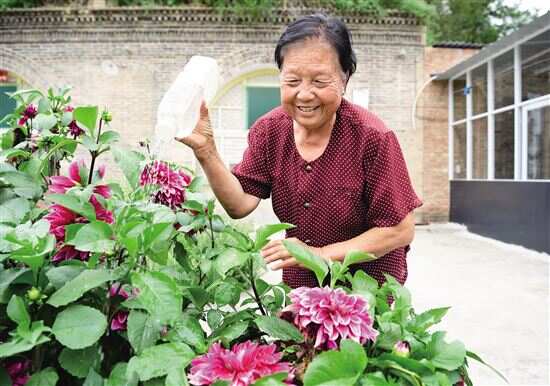 ■侯秀珍在位于延安市宝塔区南泥湾村的家中浇花(2017年9月14日摄)。 新华社发 |
