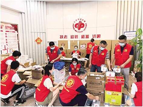 ■6月1日,佛山福彩中心党员在分装防疫医疗药箱,准备派发给全市900余家投注站。 |