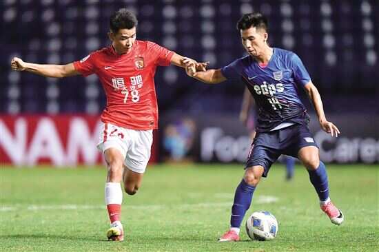 ■广州队球员张子立(左)与对手拼抢。 新华社发 |